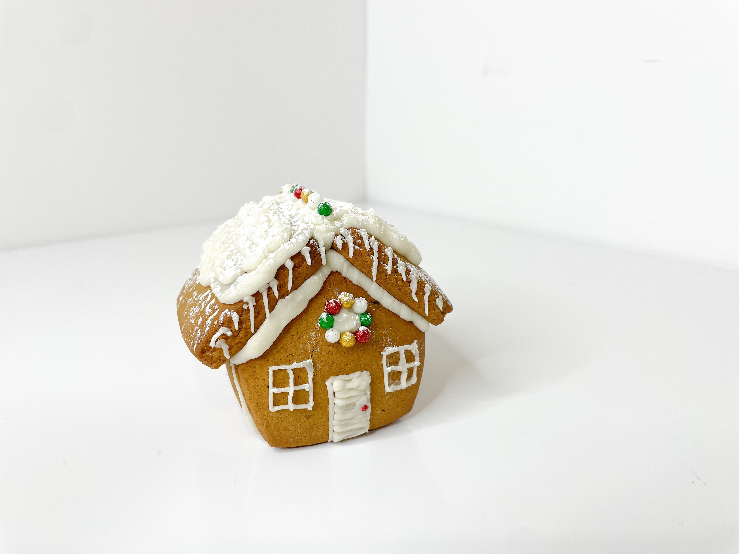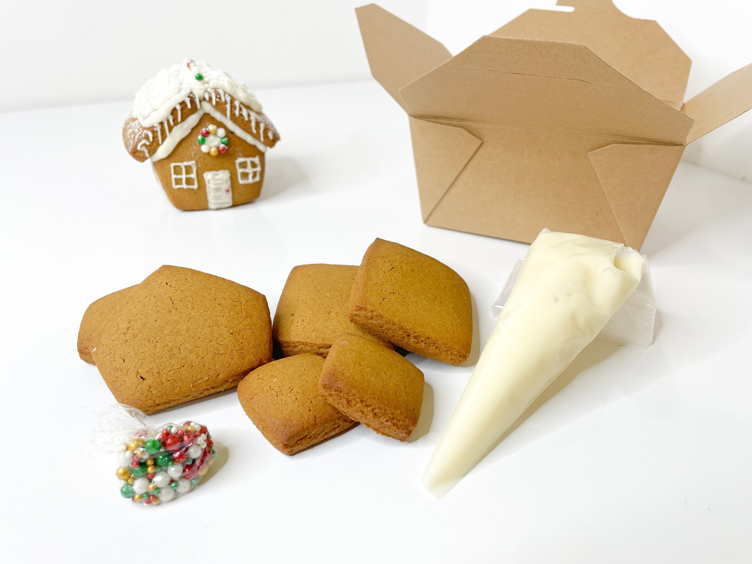 Everything you need to build a mini gingerbread house! Freshly baked gingerbread walls and roof pieces, icing to hold it all together, and holiday sprinkles for decorating